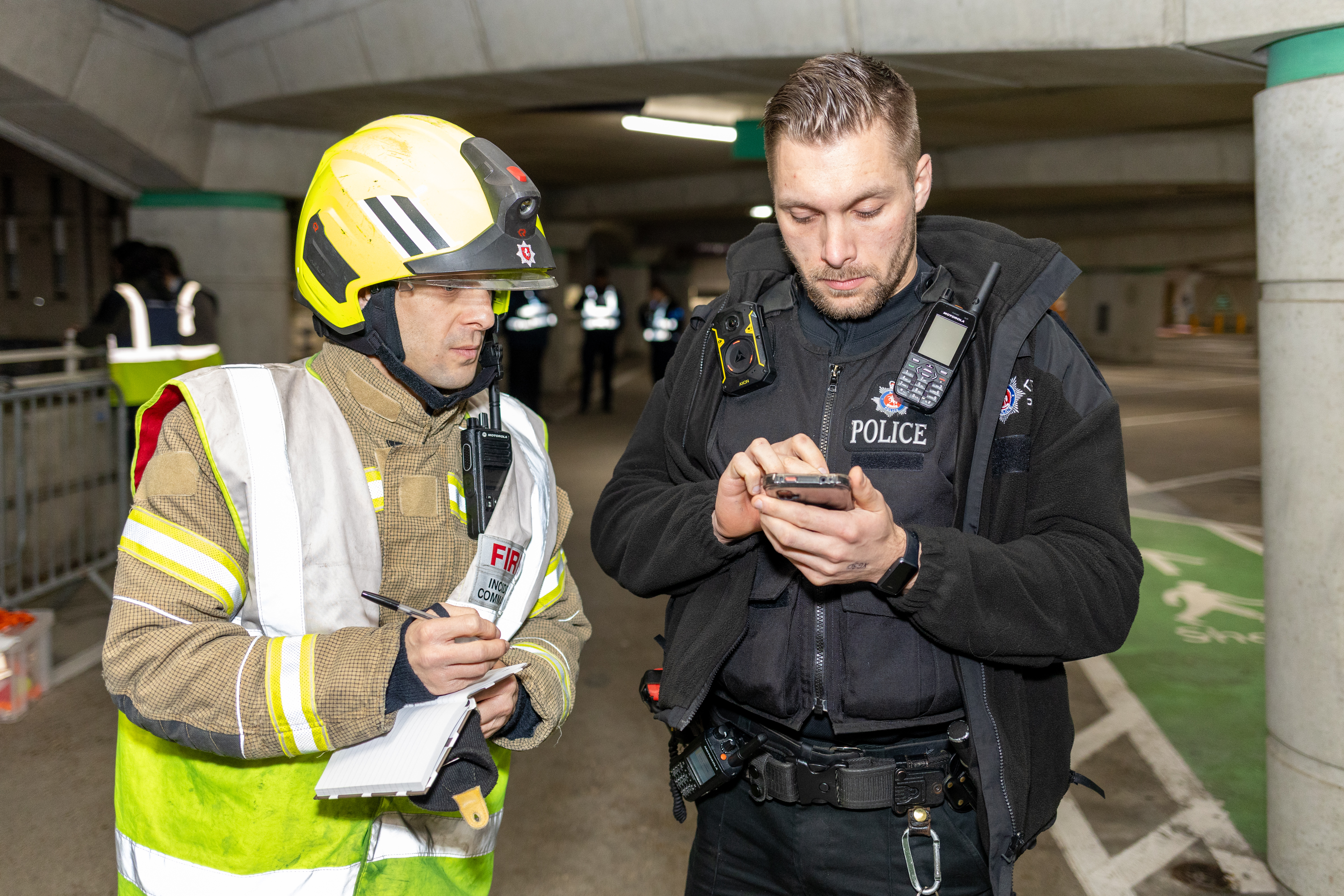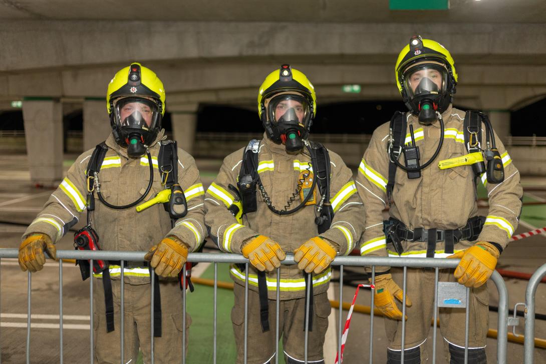 To demonstrate all skillsets, police officers were there to investigate the circumstances of the fires, and a pretend evacuation of the site took place, with paramedics on standby to treat any casualties – played by volunteers from the Casualty Union charity.